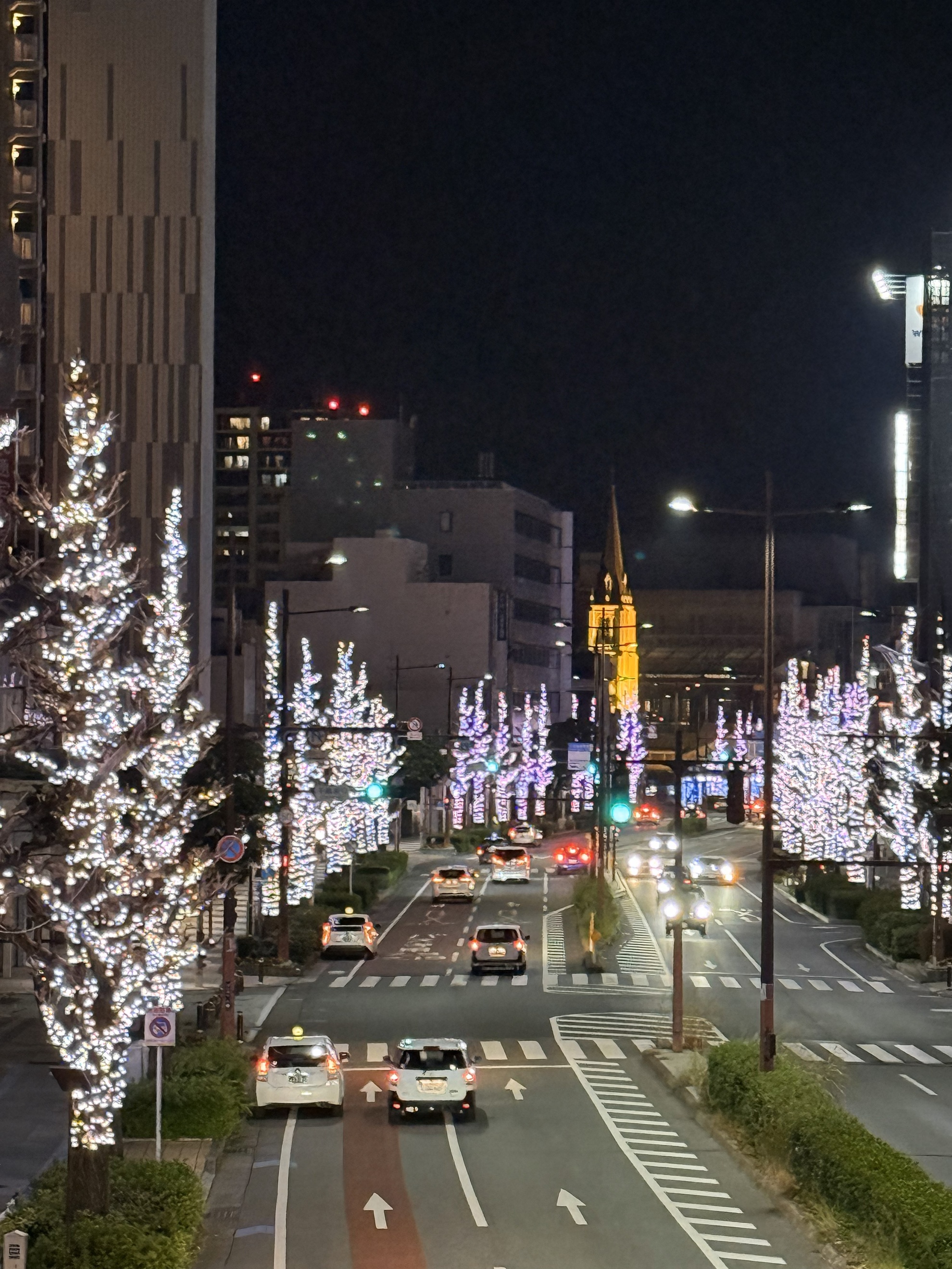 西鉄久留米駅東口広場の中央の時計台もイルミネーションで華やかに装飾され、とてもフォトジェニックなスポットになっています。